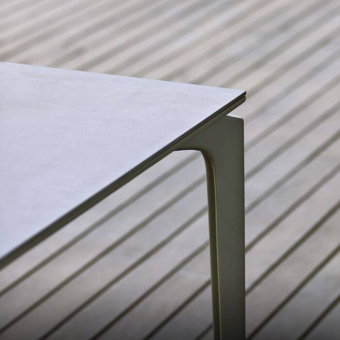 Materials: die-cast, extruded, and laminated aluminum frame with porcelain stoneware tabletop