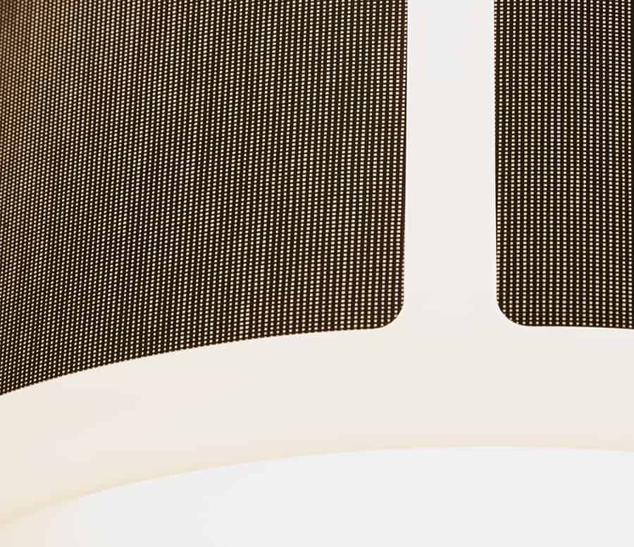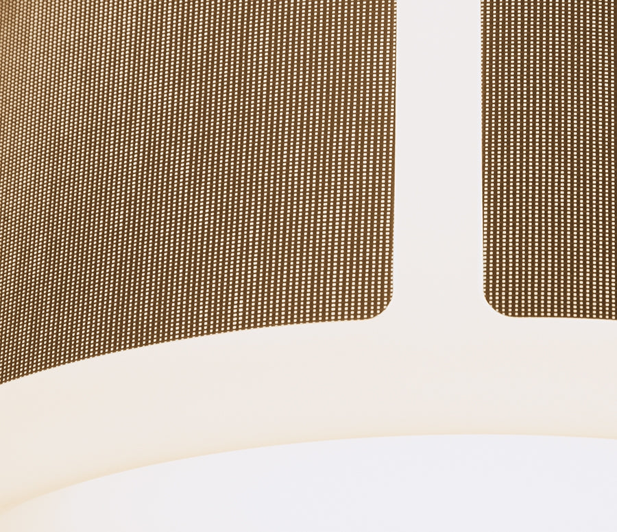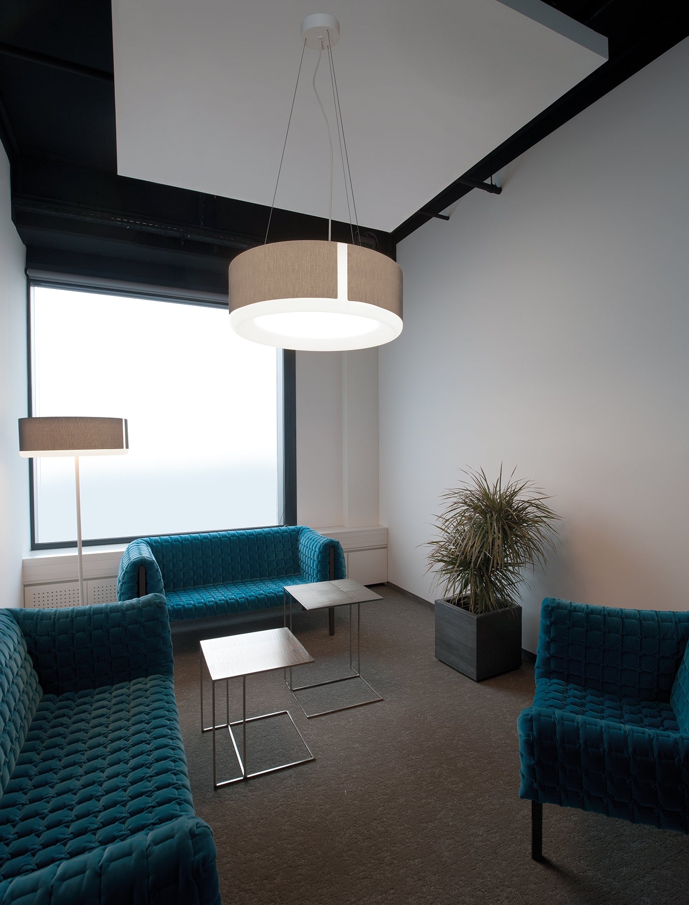Round decorative luminaire in 4 sizes. Polyethylene opal diffuser Fabric cover available in 3 colours. Structure in aluminium, white powder-coated.