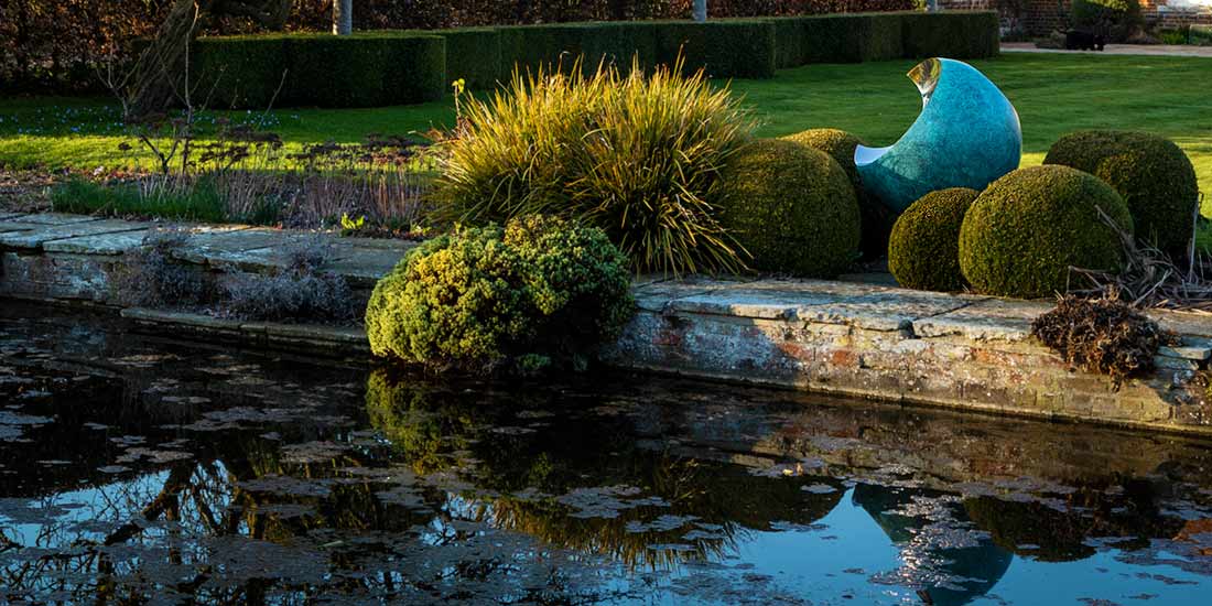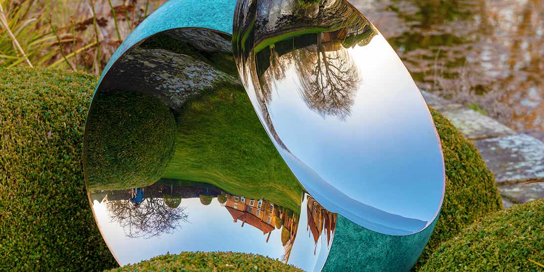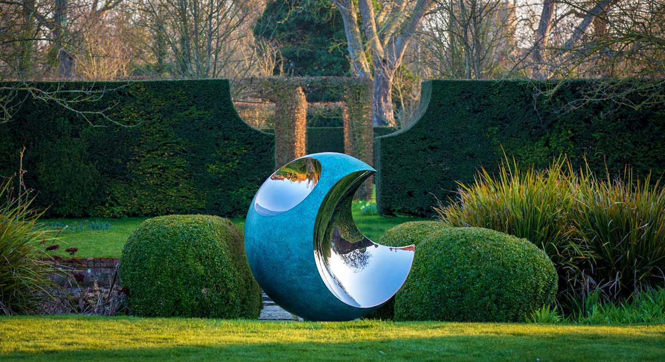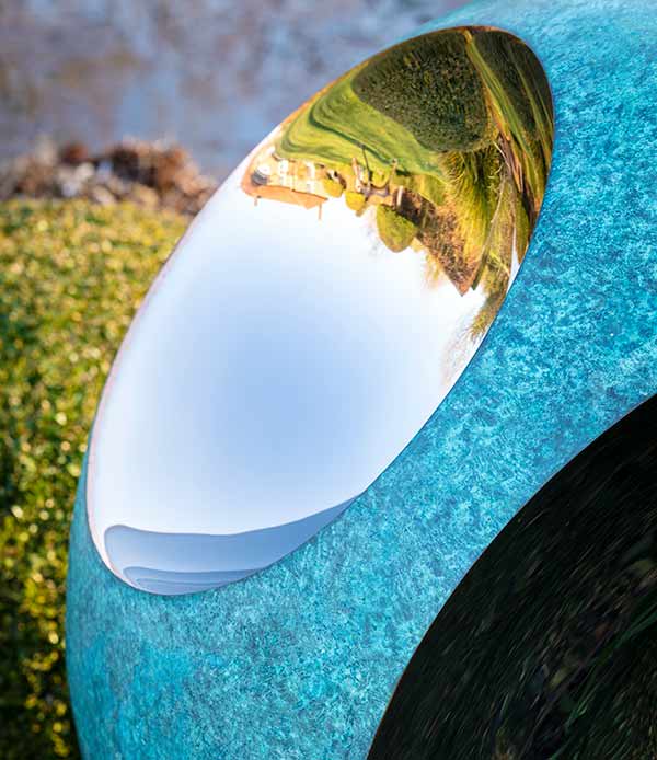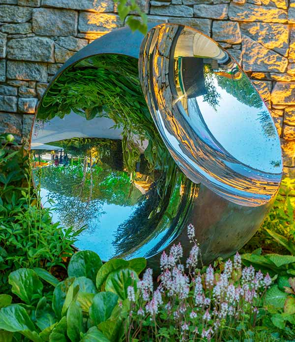 The seamless transition from a perfect sphere into parabolic mirror inlays creates a fascinating optical illusion in these unusual modern garden sculptures.