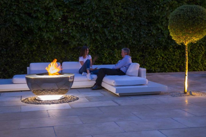 This gas fire pit water feature is comprised of an mirror-polished stainless steel outer bowl over which water circulate mesmerisingly. It has an inner sky mirror with a gas burner at the centre provides a stunning focal point and transforms a garden water feature into a stunning contemporary outdoor fireplace.