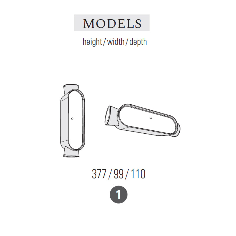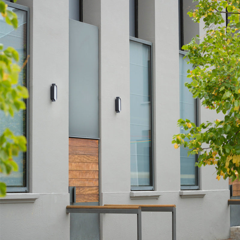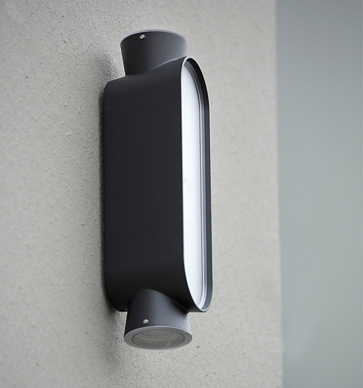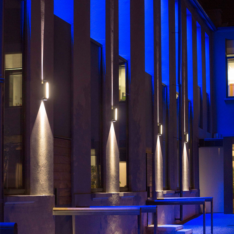 The exterior wall light is available in 24 powder coat colors with alternate beam angles. The version shown here has beam angles of 10° up and 40° down. It is rated IP65 and designed and made in France.