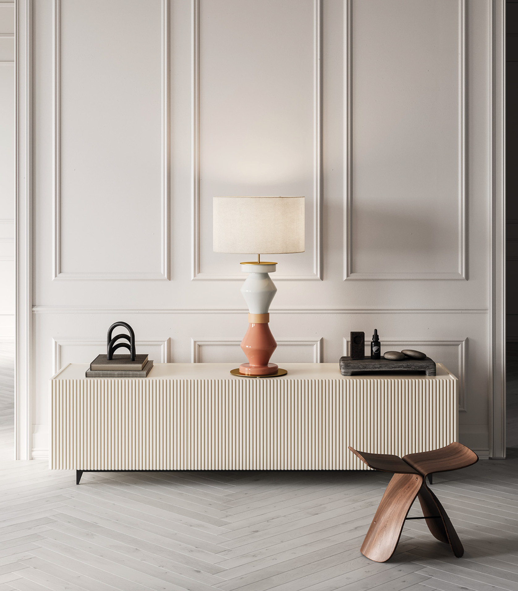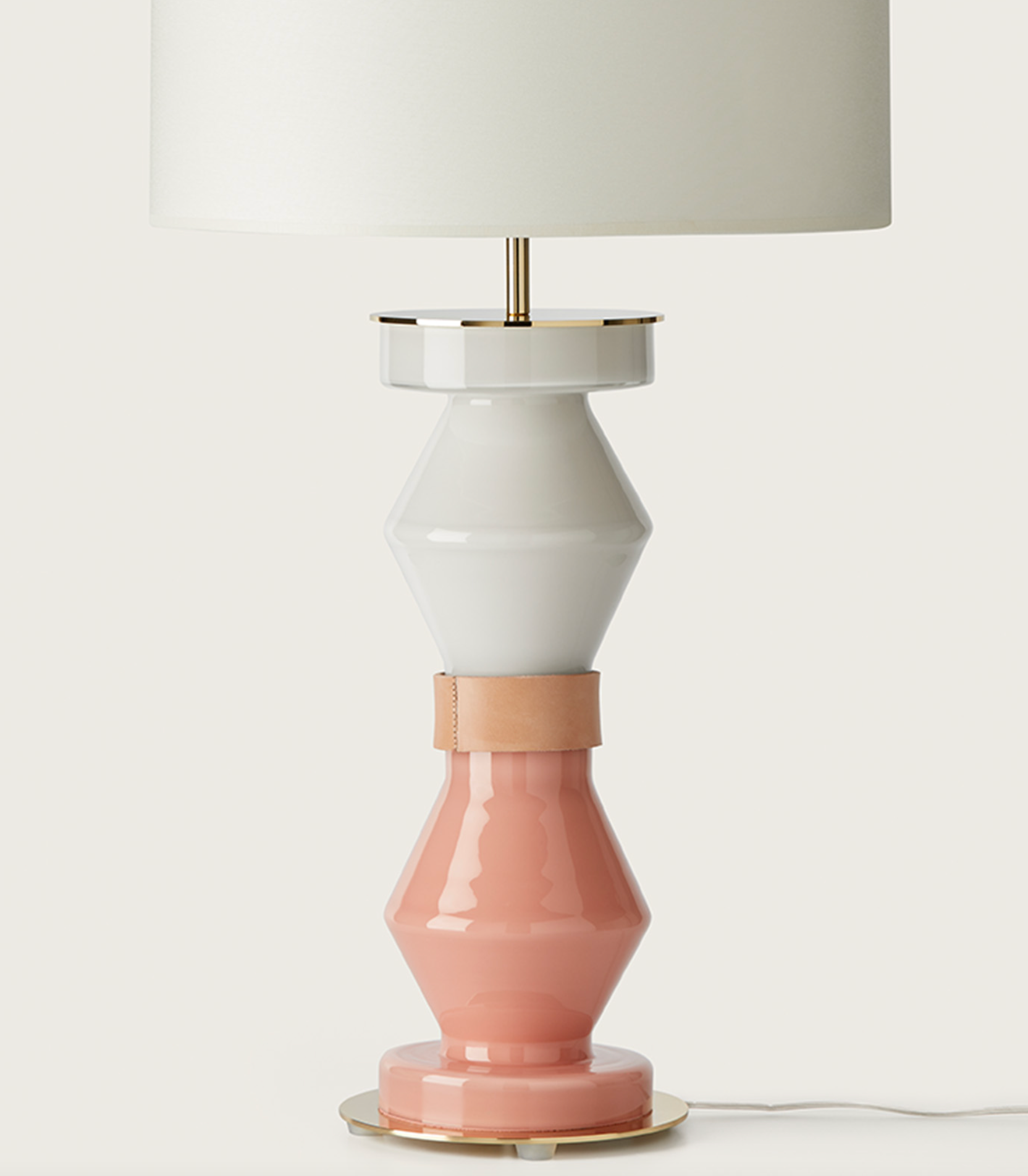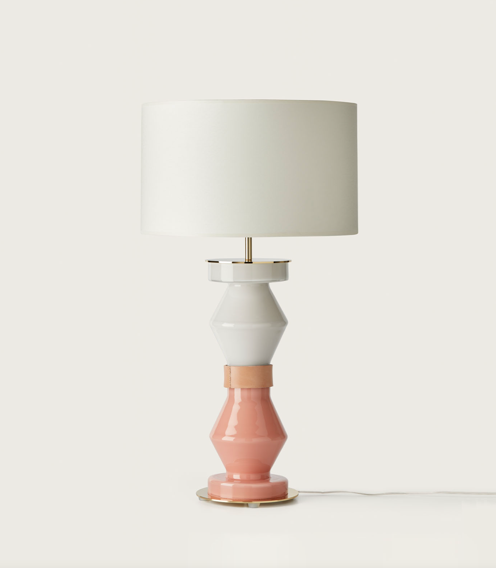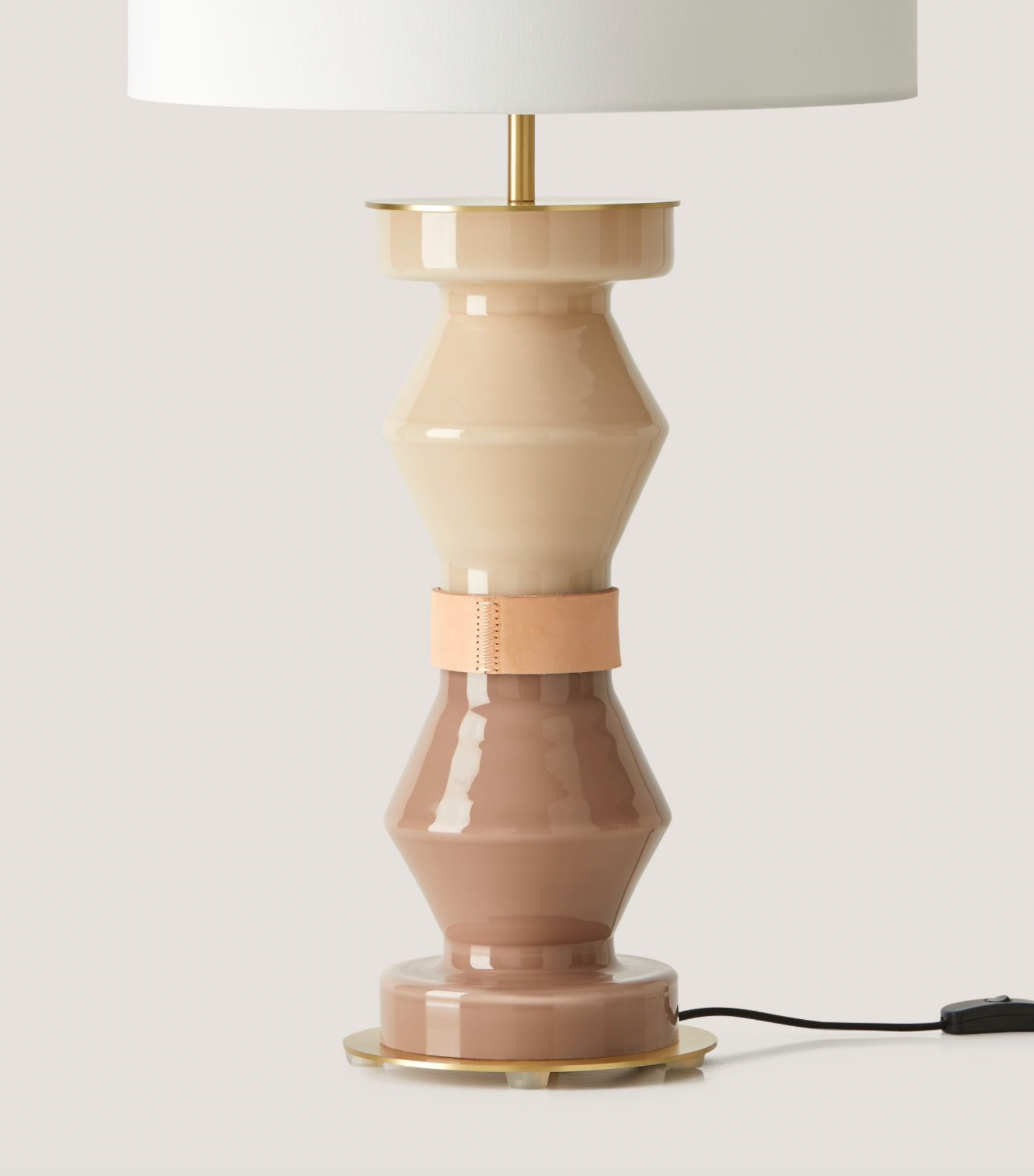 Kitta Kitta Table Lamp by Aromas Del Campo was designed by AC Studio. Kitta Kitta is a tall table lamp with a vibrantly coloured glass base that prominently features a composition of mixed forms. In the middle of the base sits a leather ornamentation that visually separates the bottom section of the base from the top of the base. A contemporary design with vibrant characteristics.
