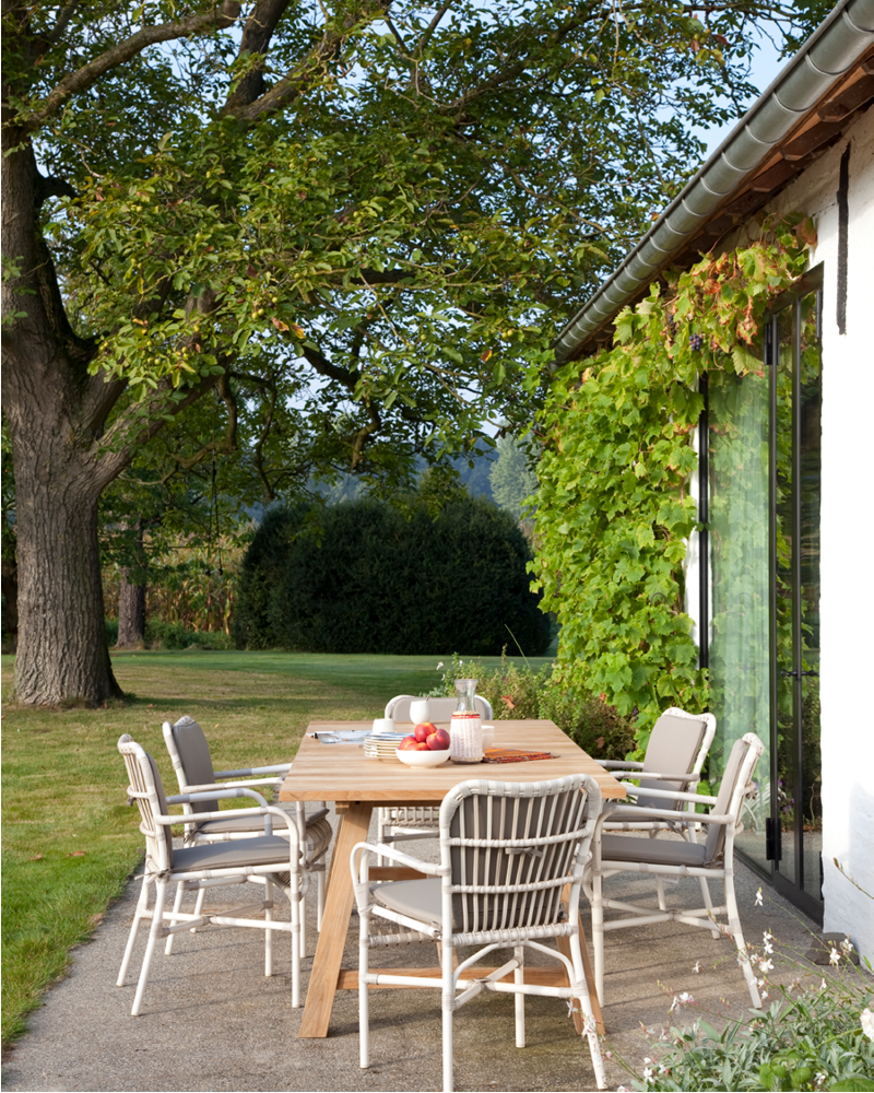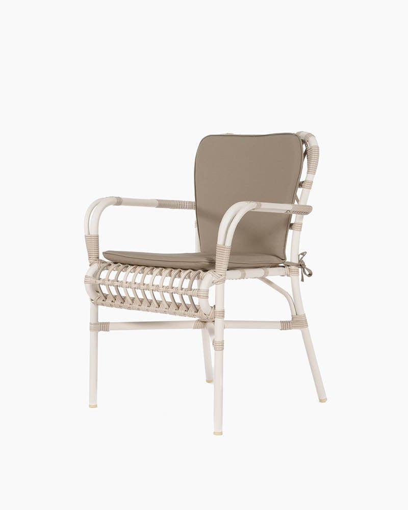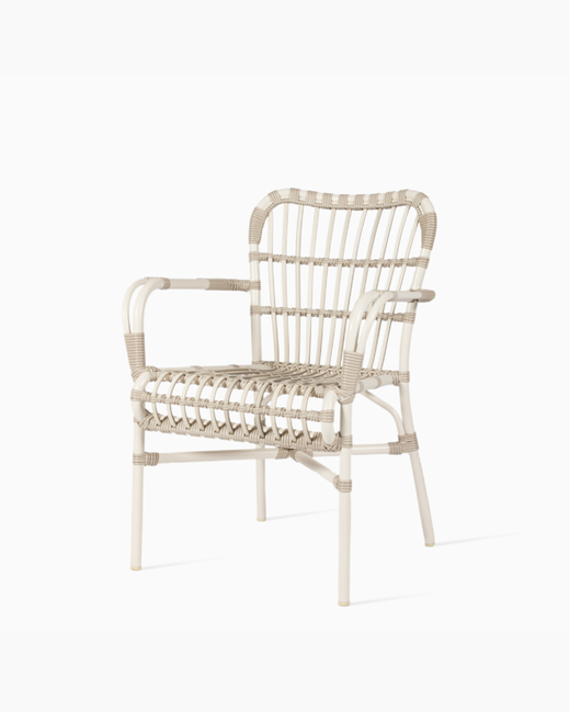 The Lucy dining armchair is a stackable garden chair with a distinct design. Available color: Off-white.