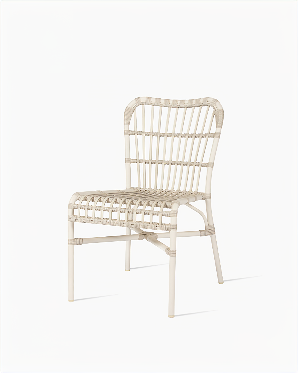 The Lucy dining chair is a light outdoor dining chair that is stackable. Available color: Off-white.
