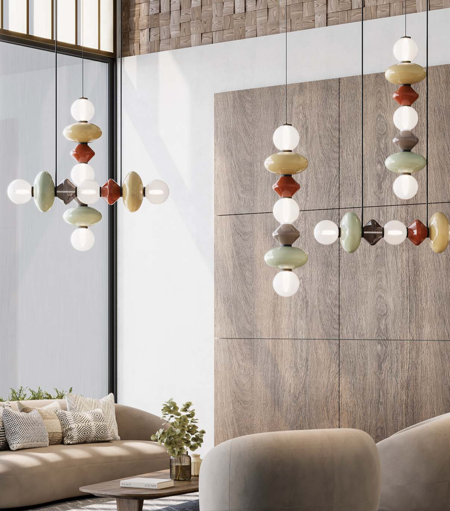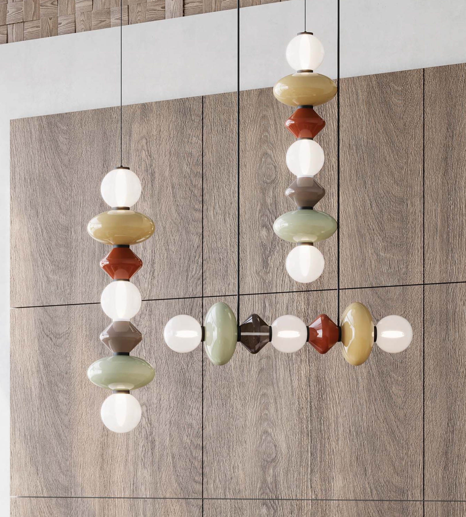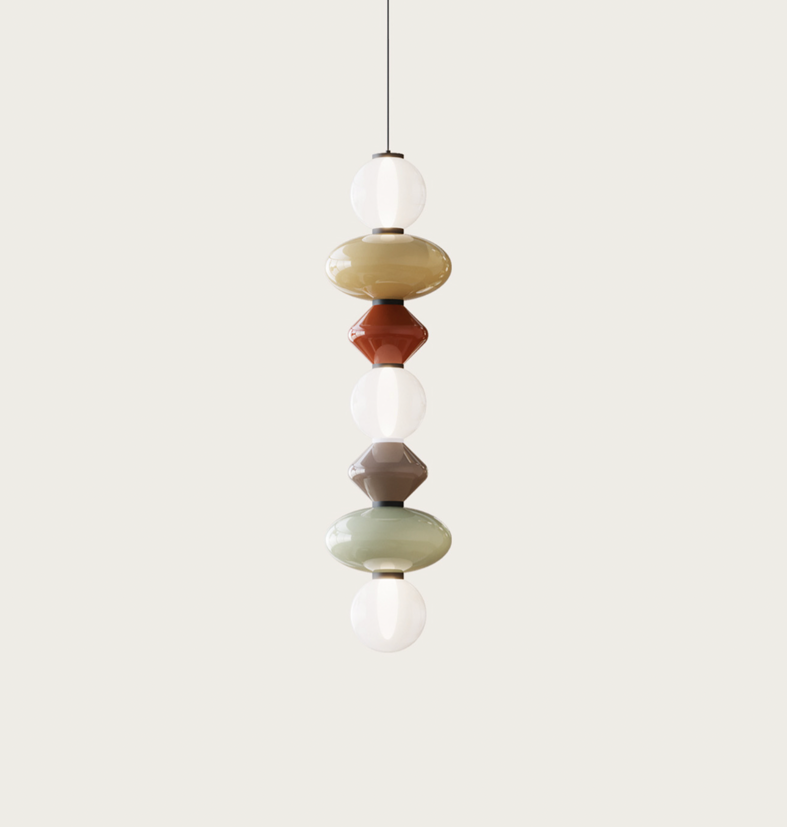 Mapi Vertical Pendant Light by Aromas Del Campo features multi-coloured stacked ornaments that evoke the allure of organic curved forms. The smooth curves and clean lines of these ornaments create a harmonious balance of colour and form, adding a touch of organic elegance to any space. A mesmerising fusion of artistry and innovation.