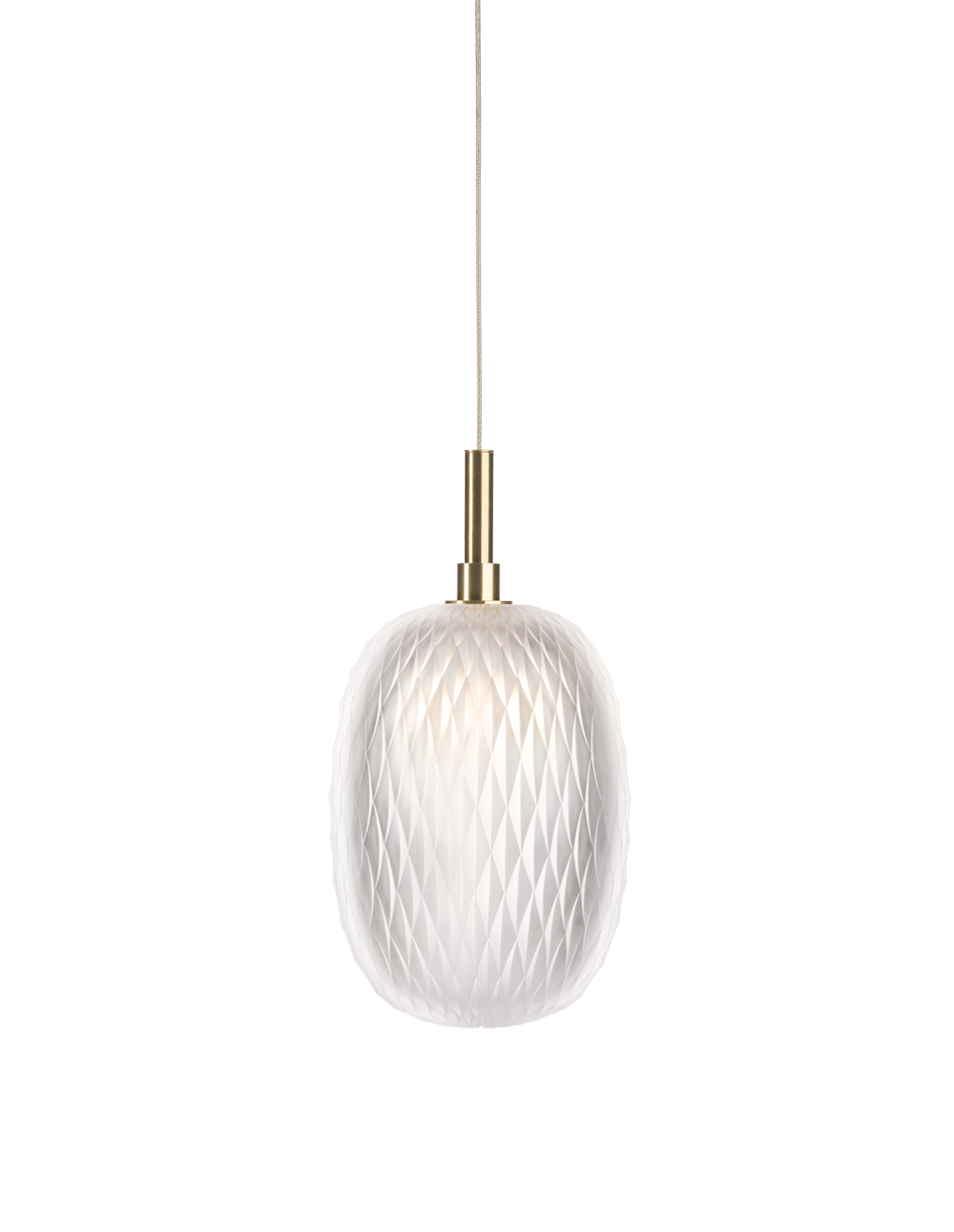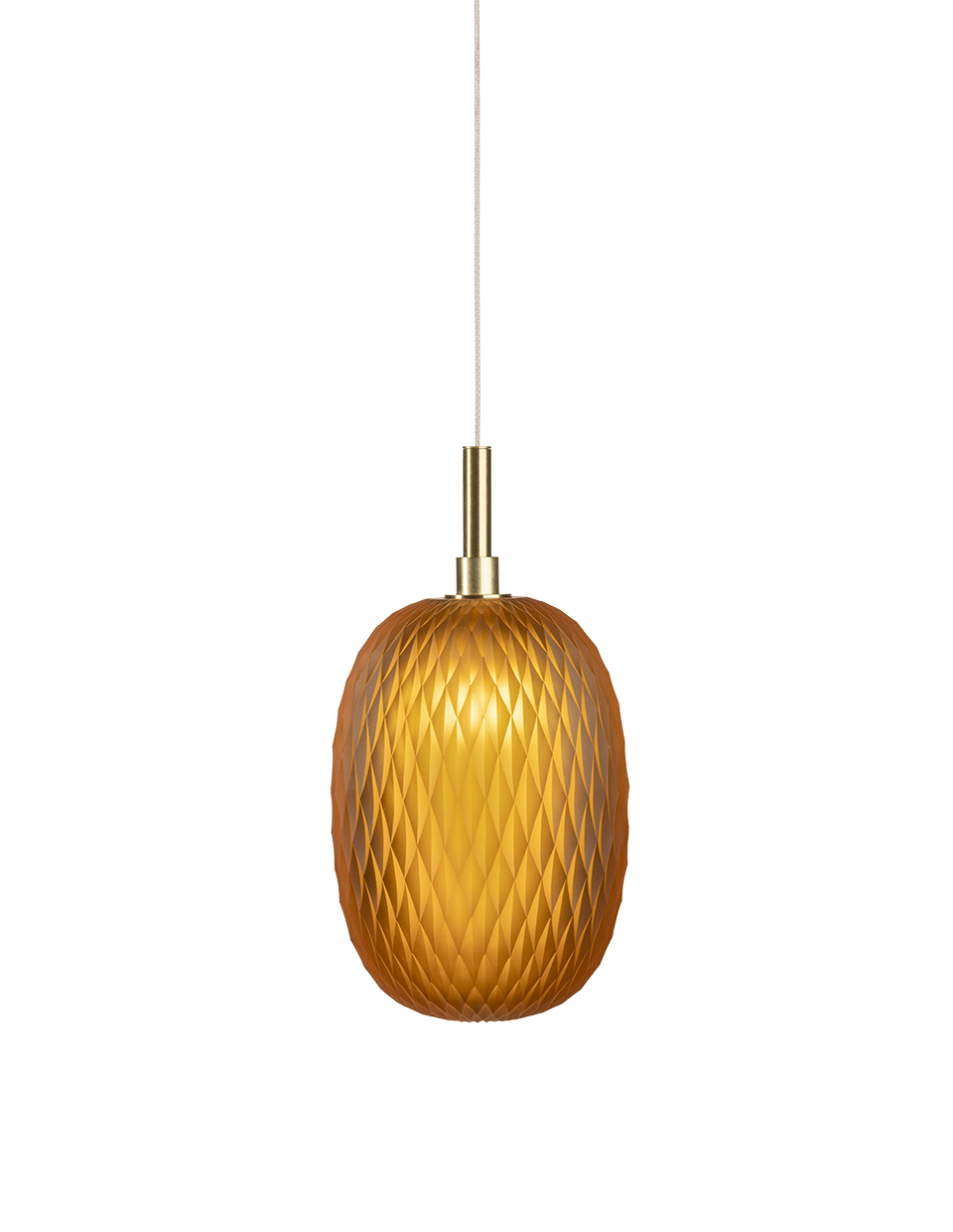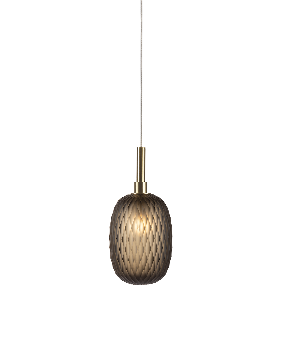 The delicate geometric cut of the Metamorphosis Gold Pendant Light comes alive with its internal light source, highlighting the Amber, Crystal or Cigar colours. Beautiful as an individual light, these pendants look even stronger in compositions.