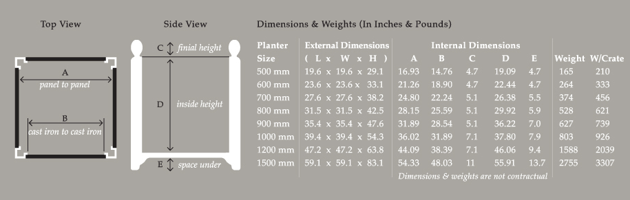 The combination of solid oak and cast iron gives these planters an unsurpassed solidity and longevity, making them as practical as they are elegant.